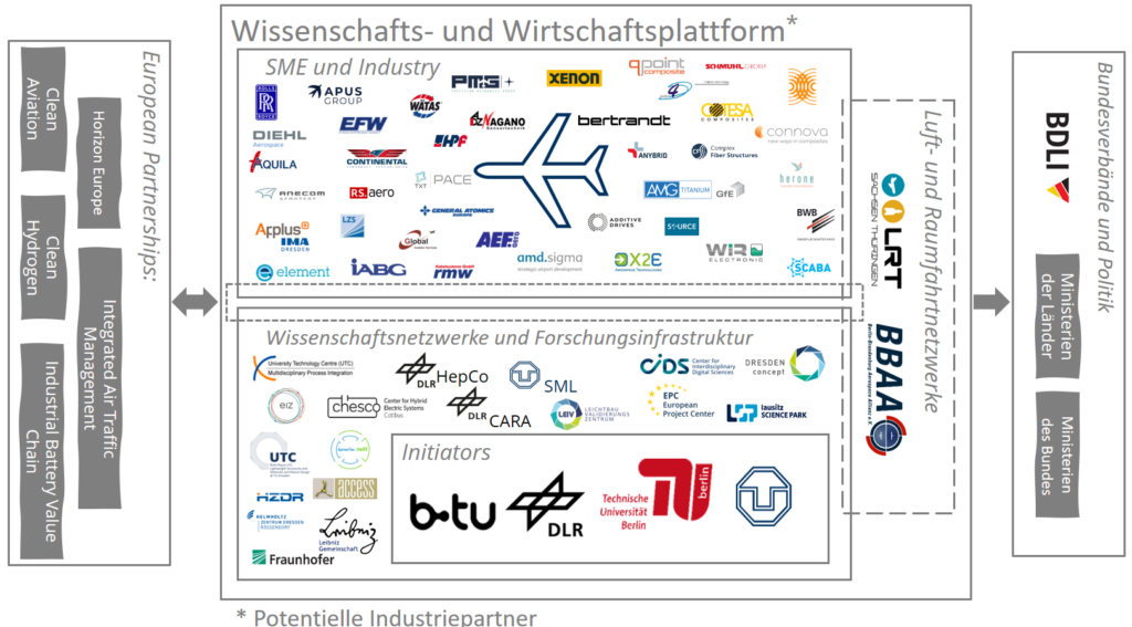 Die Koordination der Plattform obliegt den Initiatoren TU Berlin, BTU Cottbus-Senftenberg und TU Dresden sowie den DLR-Instituten für „Elektrifizierte Luftfahrtantriebe“ (Cottbus) und für „Softwaremethoden zur Produkt-Virtualisierung“ (Dresden) in enger Kooperation mit der Berlin-Brandenburg Aerospace Allianz e.V. (BBAA) und dem Kompetenzzentrum Luft- und Raumfahrttechnik Sachsen/Thüringen e.V. (LRT). Die Koordination soll über geförderte Projekte der Begleitforschung sowie Pilotprojekte flankiert werden.